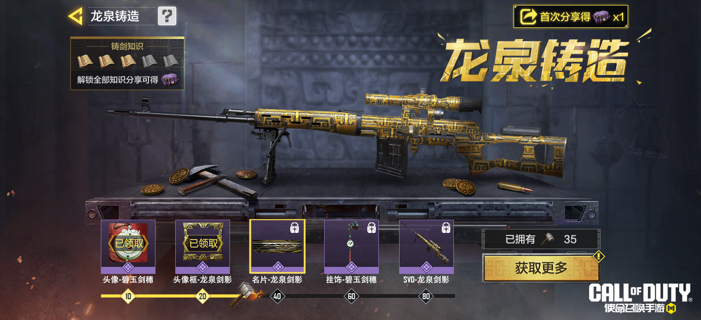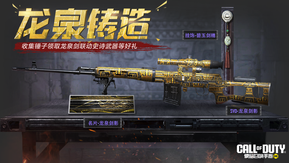 在龙泉铸造活动中,战士们可以通过完成每日任务,获得用来铸造龙泉剑的铸造锤。铸造锤达到一定数量时,即可解锁相应的奖励。奖励包含头像框-龙泉剑影、名片-龙泉剑影等精美好礼,还有最终奖励史诗级武器:SVD-龙泉剑影。